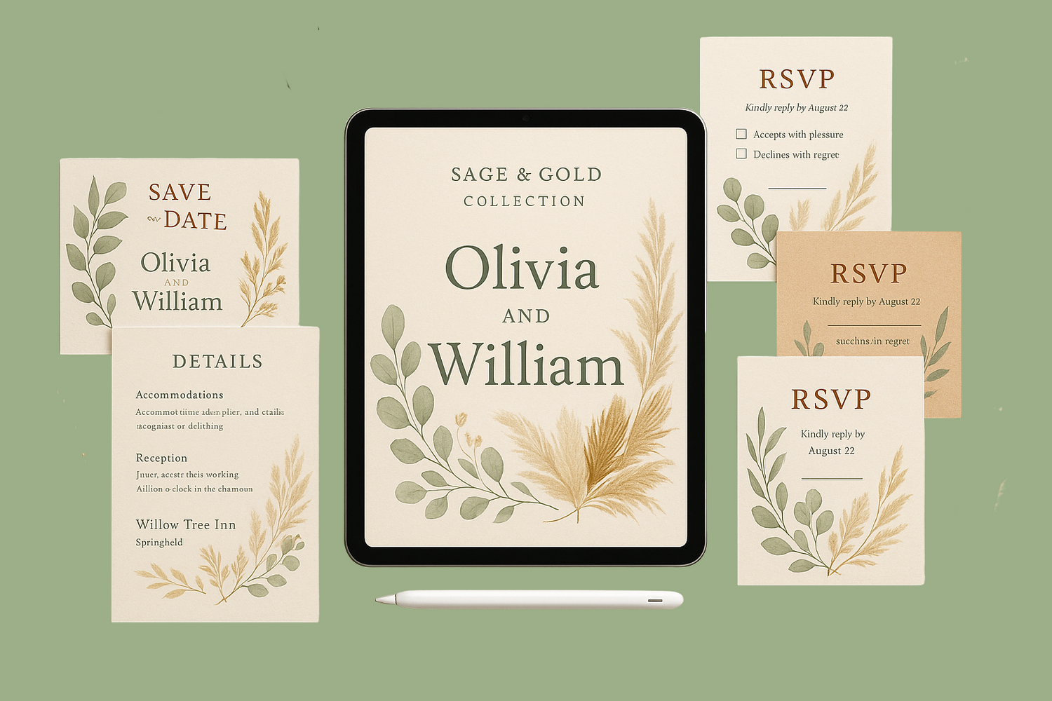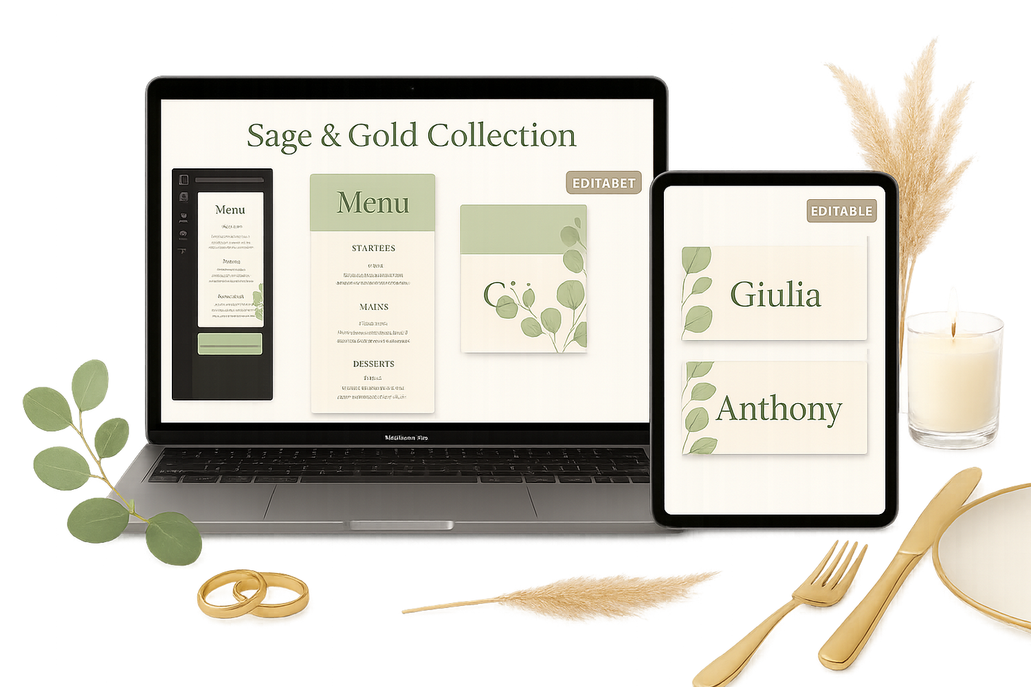 The Sage & Gold Collection is a comprehensive digital wedding ecosystem that seamlessly blends elegant Boho Chic design with cutting-edge planning technology. This all-in-one solution includes customizable wedding templates, interactive Excel planning tools, and print-ready stationery - all beautifully coordinated in timeless sage green and gold tones.