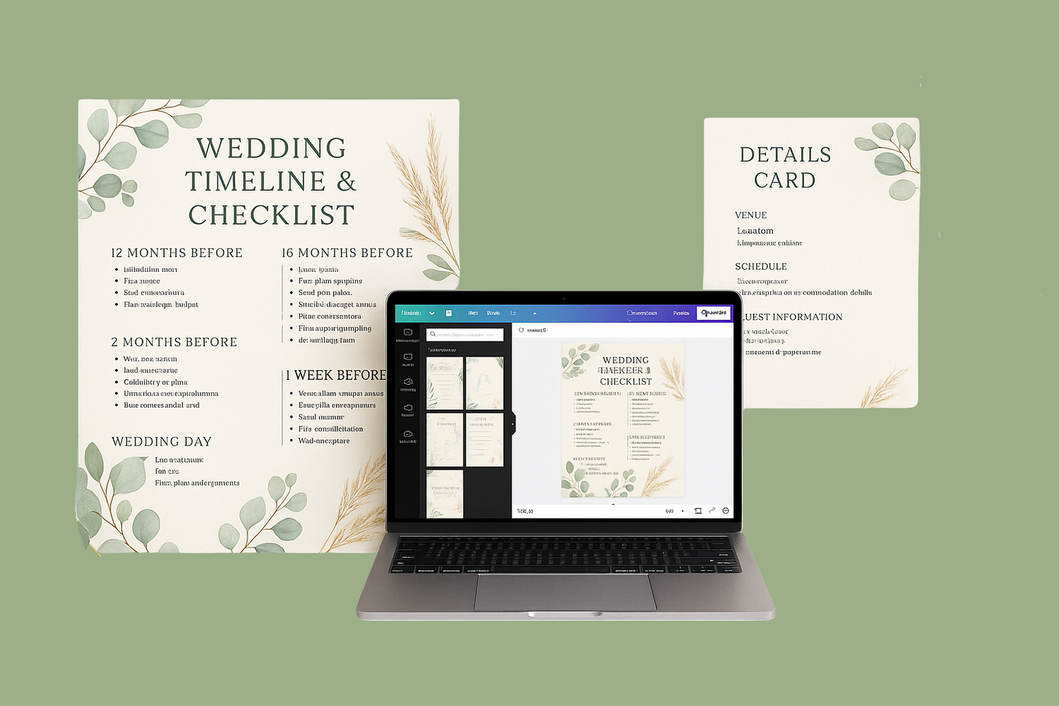 Export high-resolution PDFs for professional or home printing. Use digital versions on iPad/tablet for interactive experience. Share digital files with vendors and guests via email. Print on quality cardstock (recommendations included). Eco-friendly options with fully digital solutions for sustainable weddings.