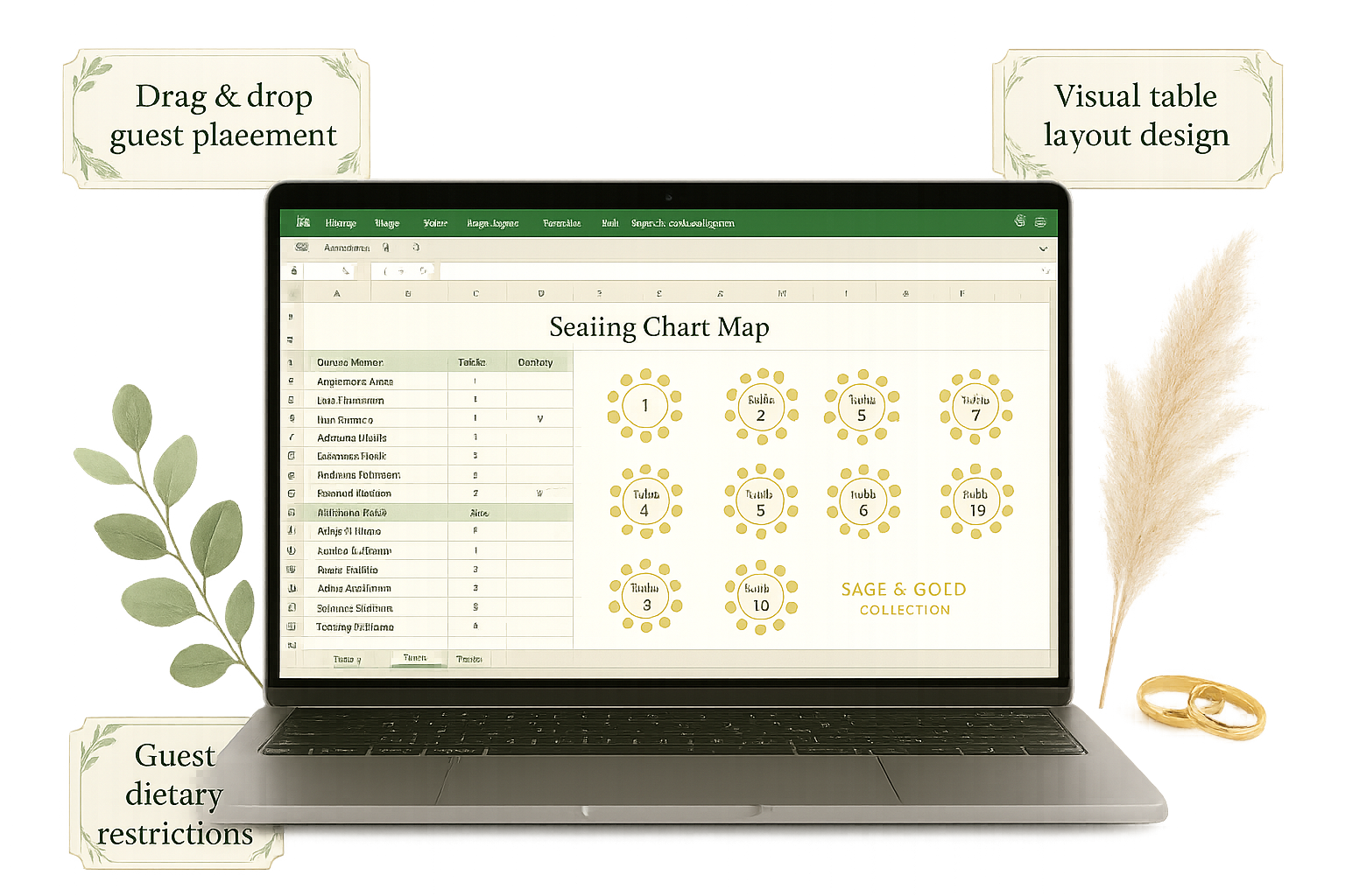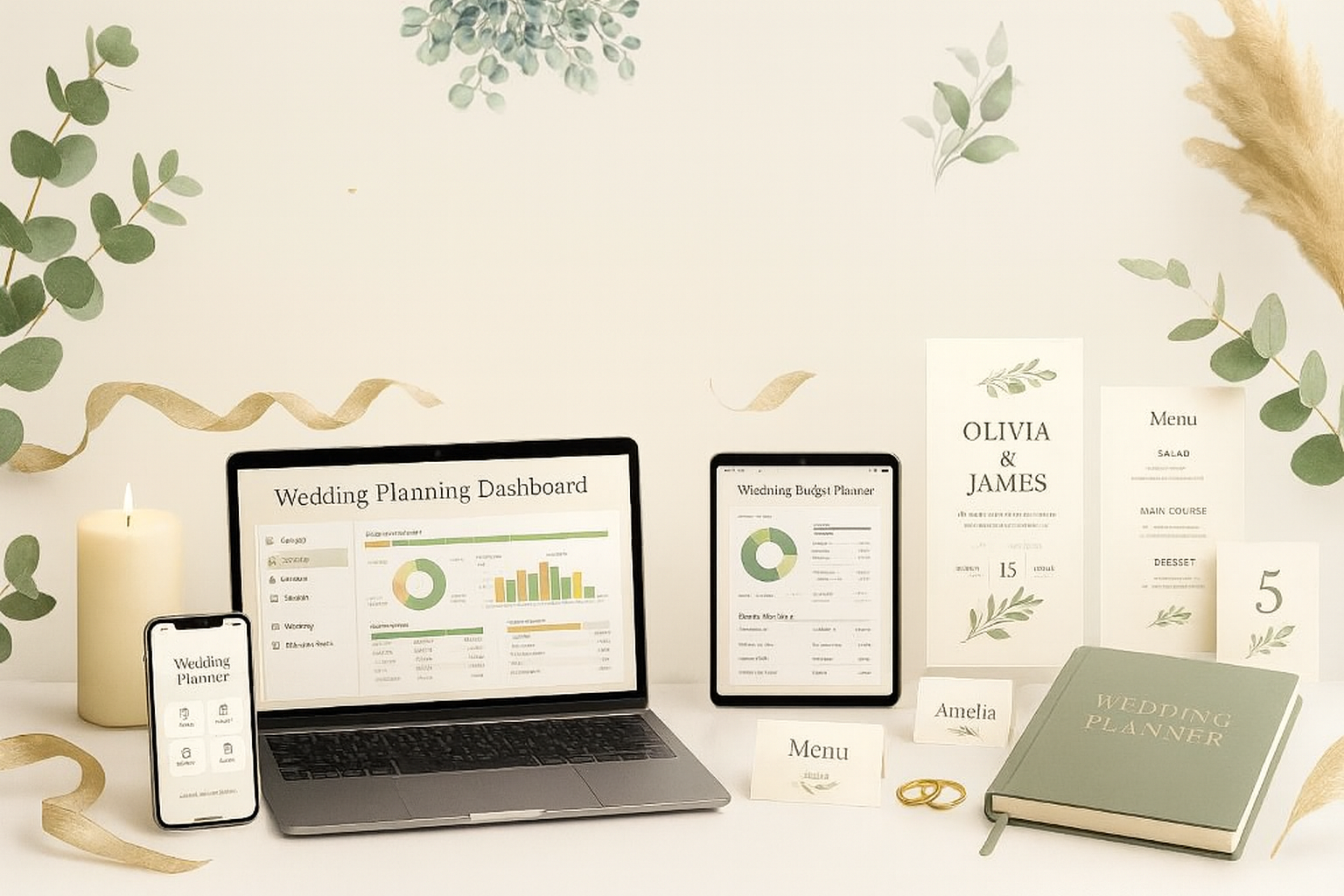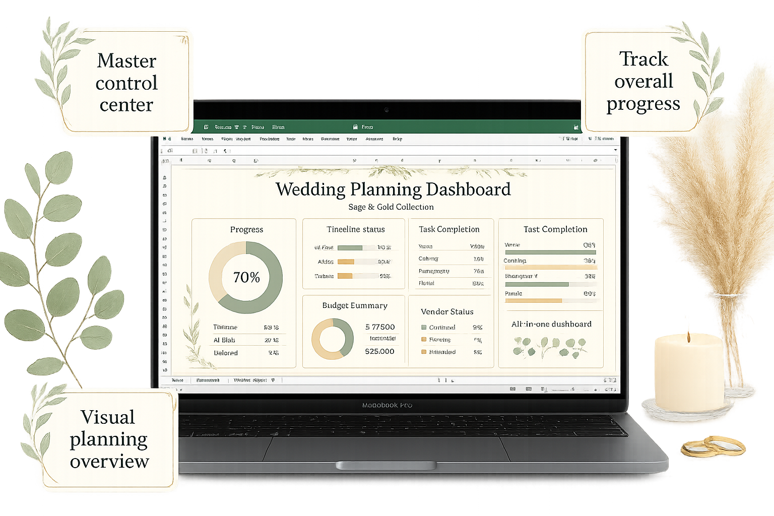 The Sage & Gold Collection is a comprehensive digital wedding ecosystem that seamlessly blends elegant Boho Chic design with cutting-edge planning technology. This all-in-one solution includes customizable wedding templates, interactive Excel planning tools, and print-ready stationery - all beautifully coordinated in timeless sage green and gold tones.