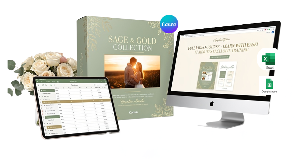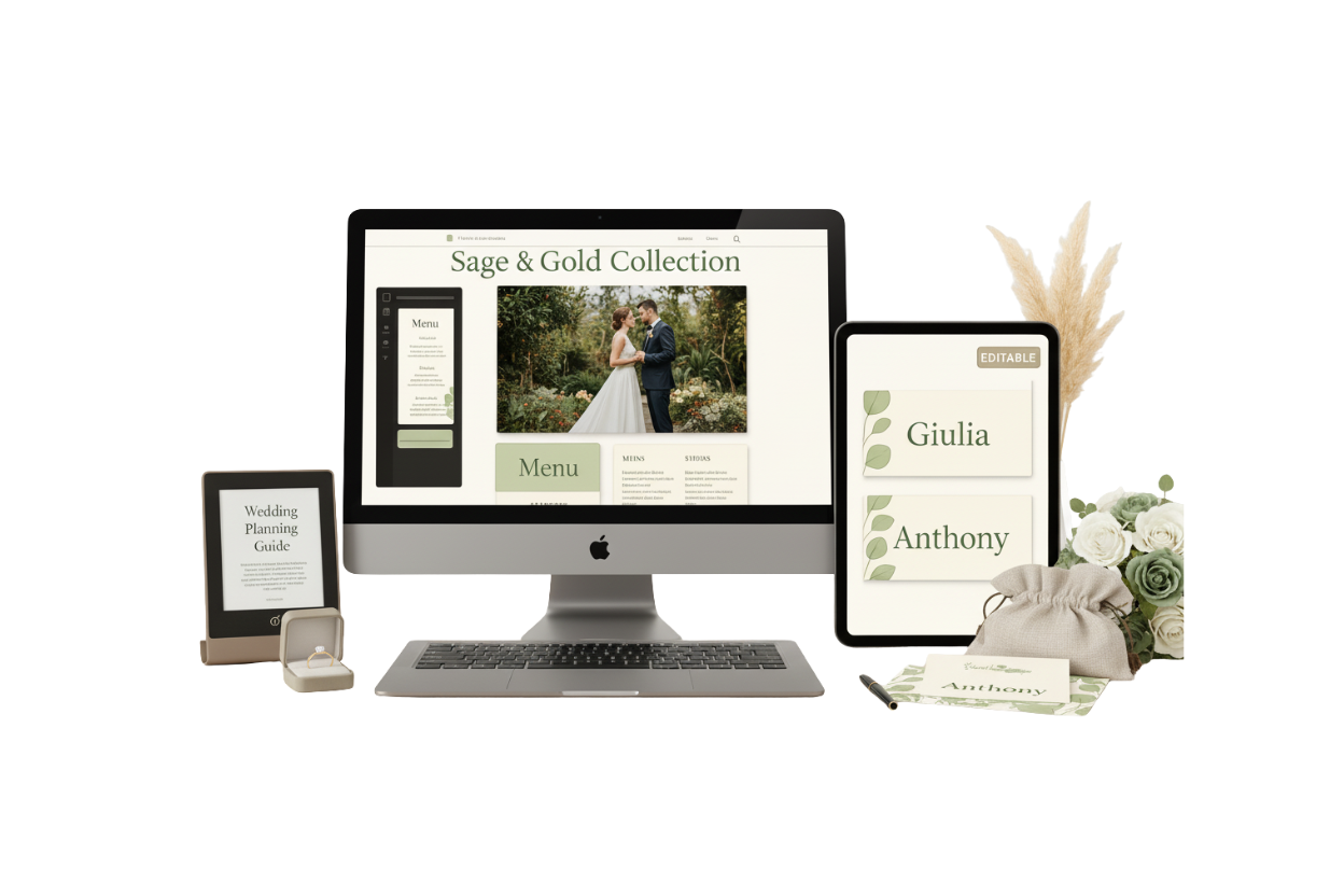 The Sage & Gold Collection is a comprehensive digital wedding ecosystem that seamlessly blends elegant Boho Chic design with cutting-edge planning technology. This all-in-one solution includes customizable wedding templates, interactive Excel planning tools, and print-ready stationery - all beautifully coordinated in timeless sage green and gold tones.